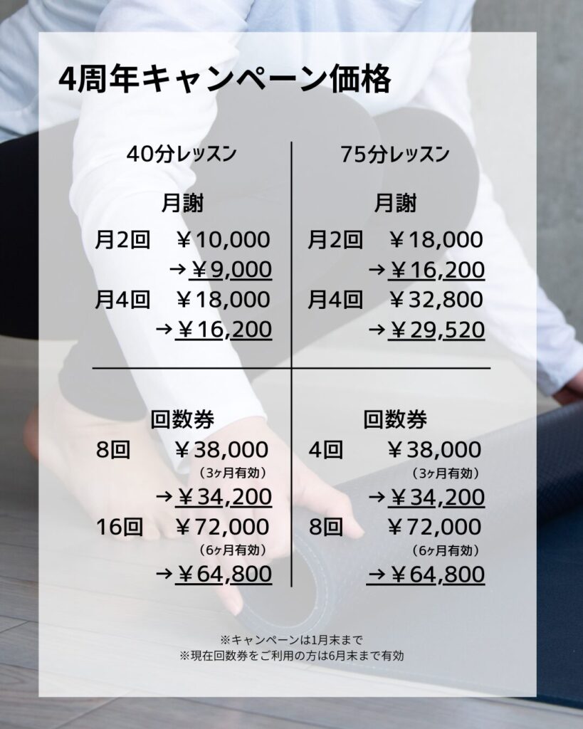 4周年の感謝を込めて、1月はスタジオパーソナルレッスンの料金を10%OFFとし、オリジナルノベルティバッグをプレゼントしております。
